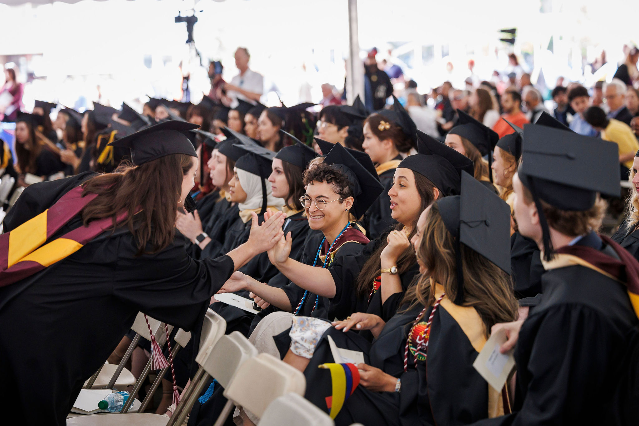 Her fellow speakers shared similar words of wisdom, imploring the graduates to apply the lessons, skills, and knowledge they have accumulated at BCSSW to build a more equitable world. Remarks were frequently punctuated by whoops and cheers from an audience of more than 1,000 people who filled a big tent on the lower campus lawn to watch more than 240 graduates receive diplomas wrapped in gold and maroon bows.